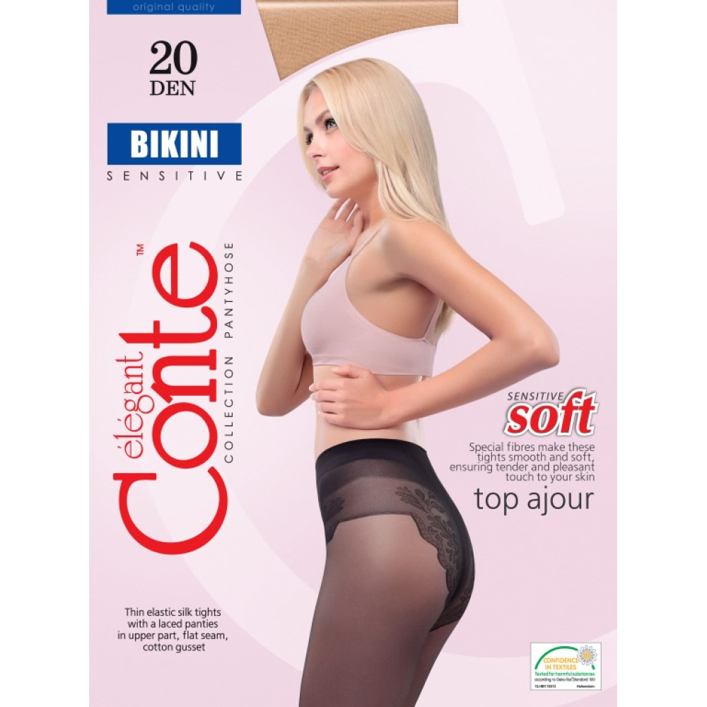 Bikini 20 is een licht glanzende 20 denier panty met bewerkt broekje. De panty heeft een comfortabele tailleband op reguliere hoogte en is voorzien van platte naden, een katoenen kruisje en verstevigde tenen.