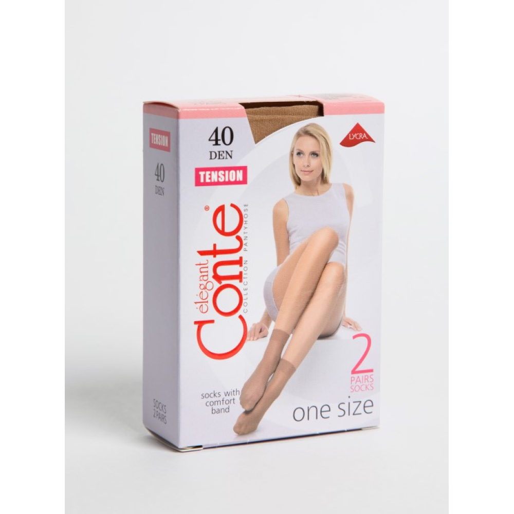 TENSION 40 sokken zijn dunne pantysokken met een dikte van 40 denier, verpakt per 2 paar in een doos. Dankzij voldoende elasticiteit passen ze in elke maat en ze zijn perfect voor alledaags gebruik. De sokken hebben verstevigde tenen en zijn voorzien van een brede elastische top die niet afglijdt en tegelijkertijd geen druk uitoefent. Kies tussen de 3 populairste kleuren: Natural, Bronz, Shade, Mocca en Zwart.